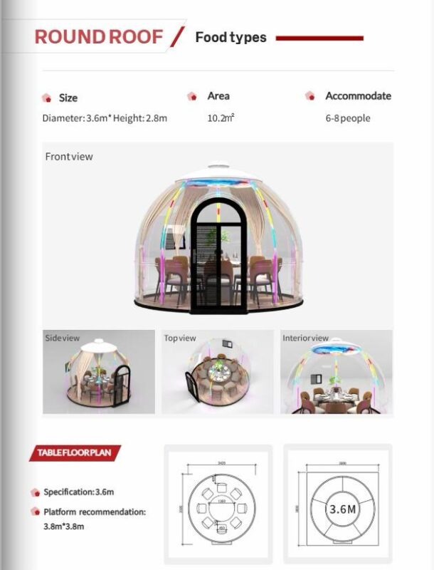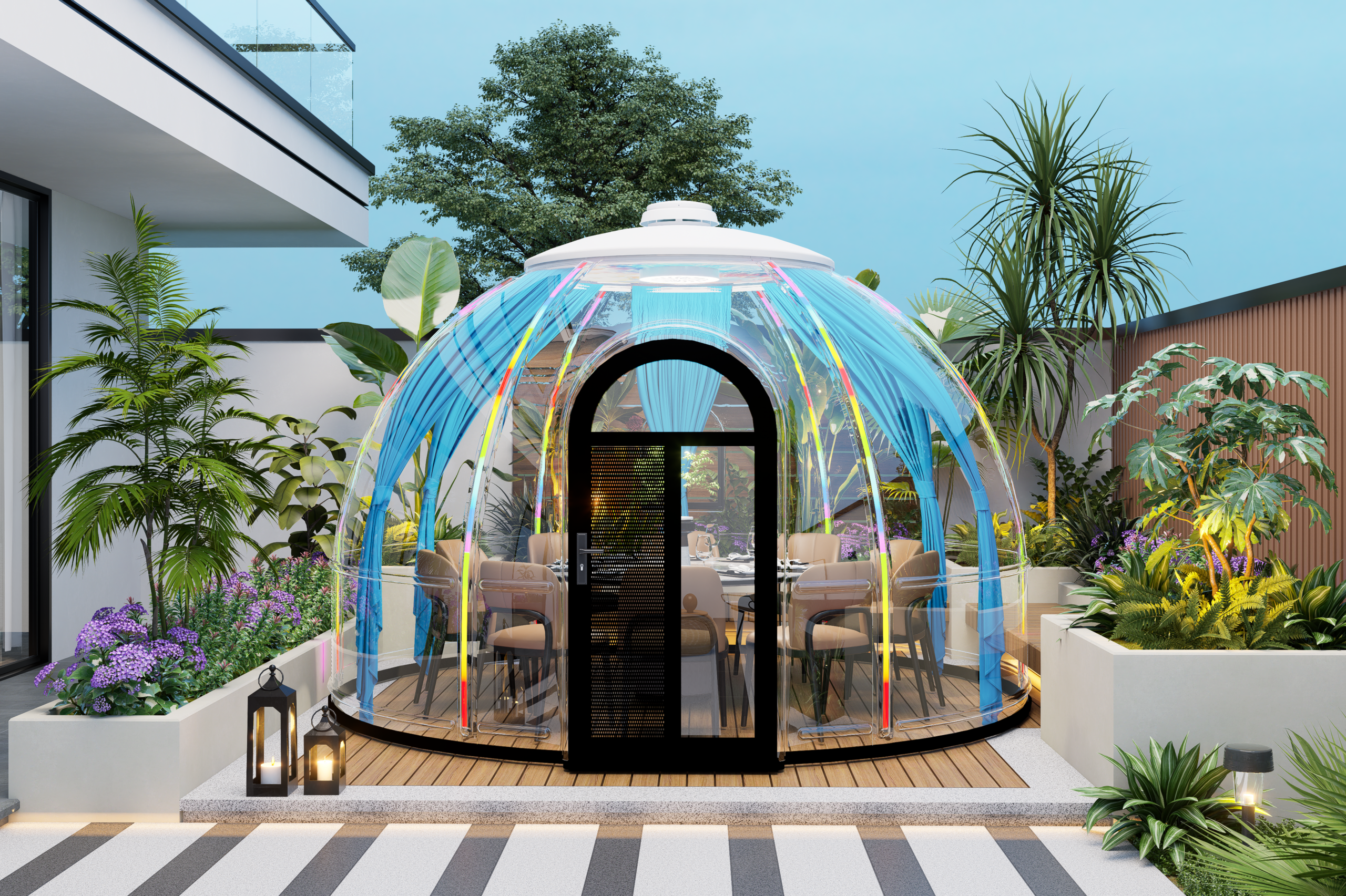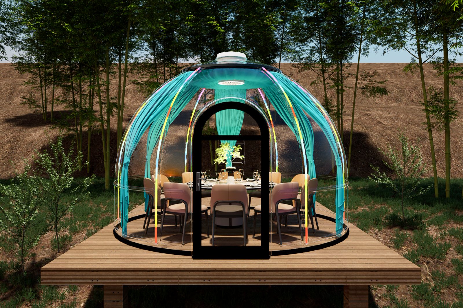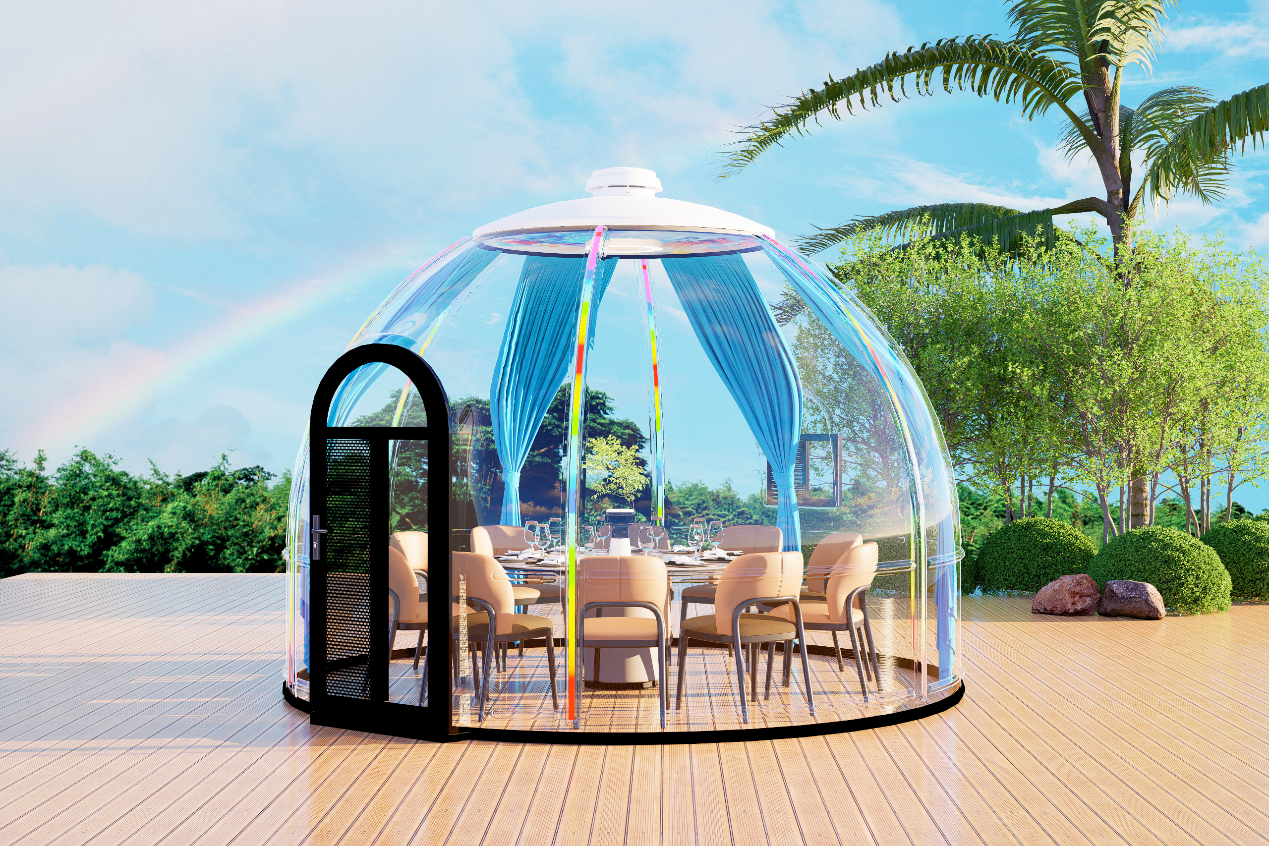 Designed for flexibility and quick installation, this dome capsule is perfect for outdoor dining areas, cafés, resorts, events, lounges, and experiential spaces. Fully enclosed and weather-resistant, it provides comfort, protection, and standout aesthetics in one elegant solution.