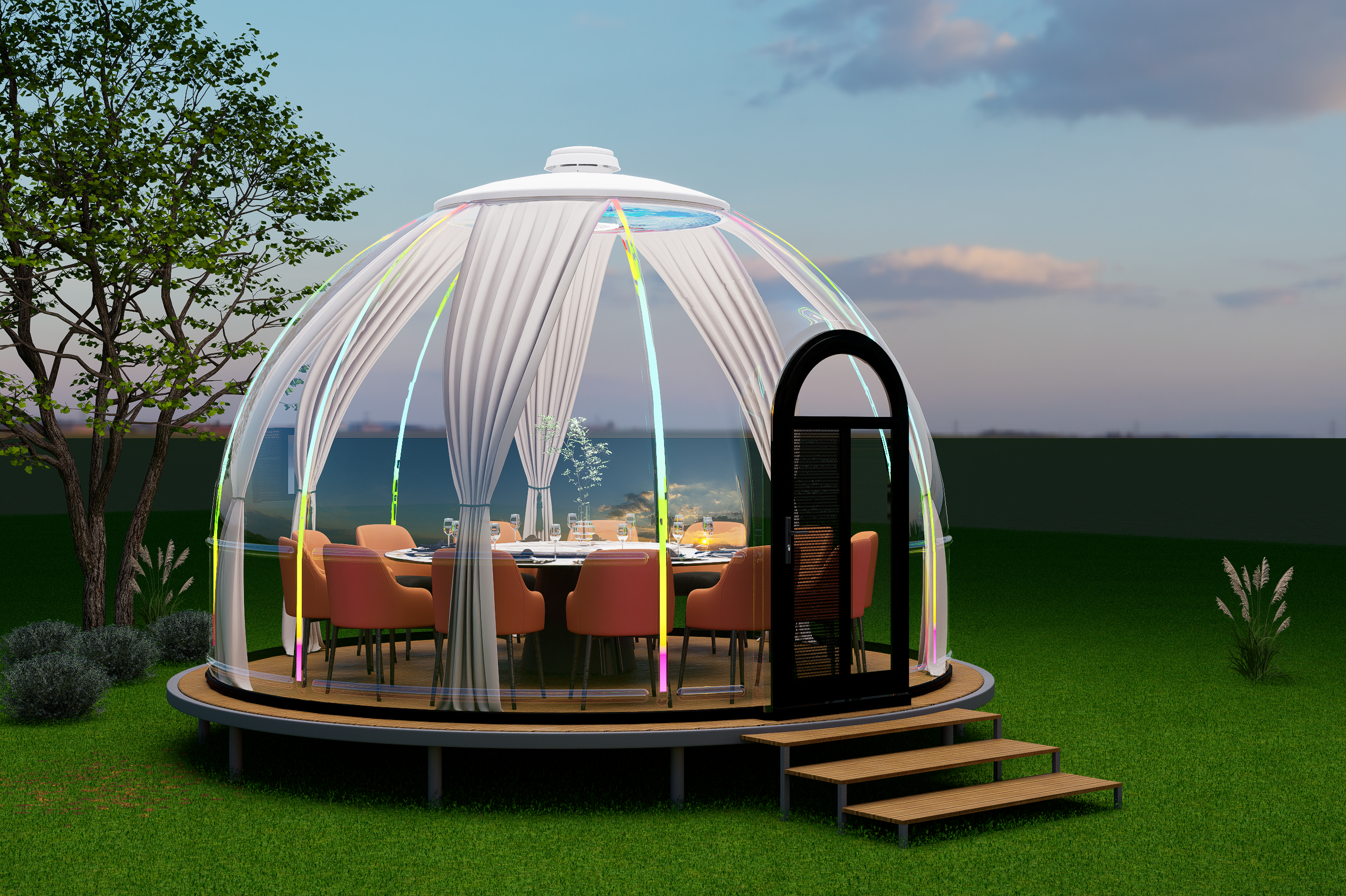 A modern glass dome capsule designed for immersive living and unique experiences. With a panoramic structure and open interior, it’s ideal for dining, leisure, events, and boutique hospitality use.