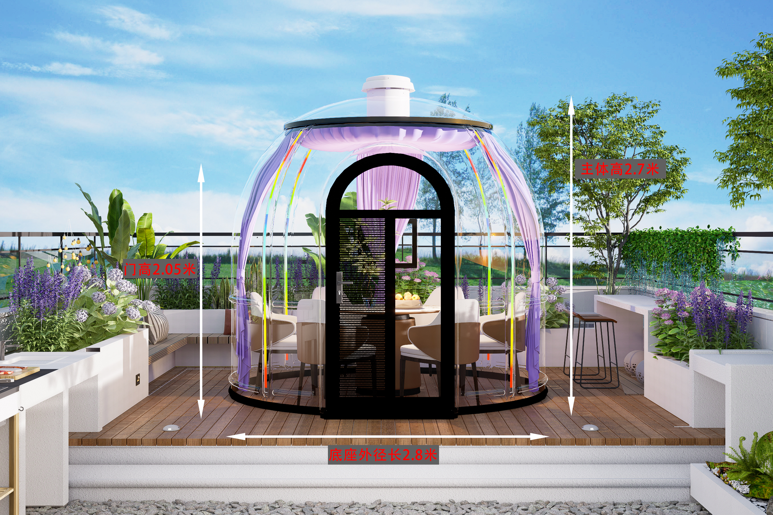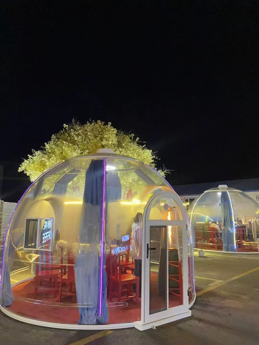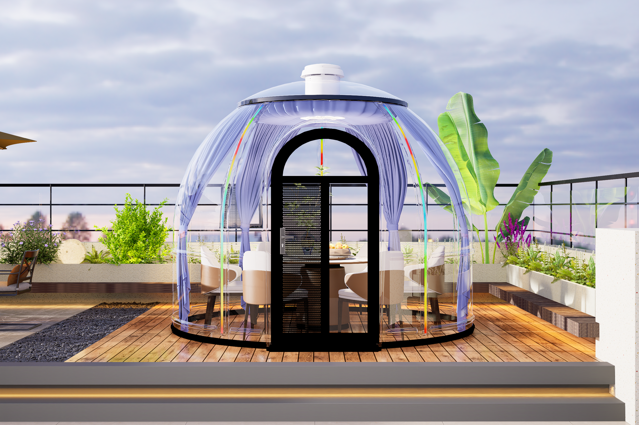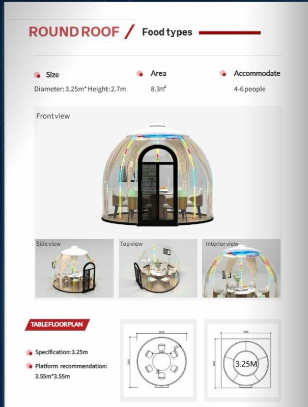 Designed for flexibility and quick installation, this dome capsule is perfect for outdoor dining areas, cafés, resorts, events, lounges, and experiential spaces. Fully enclosed and weather-resistant, it provides comfort, protection, and standout aesthetics in one elegant solution.