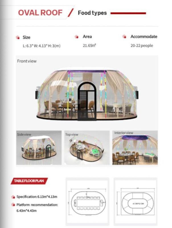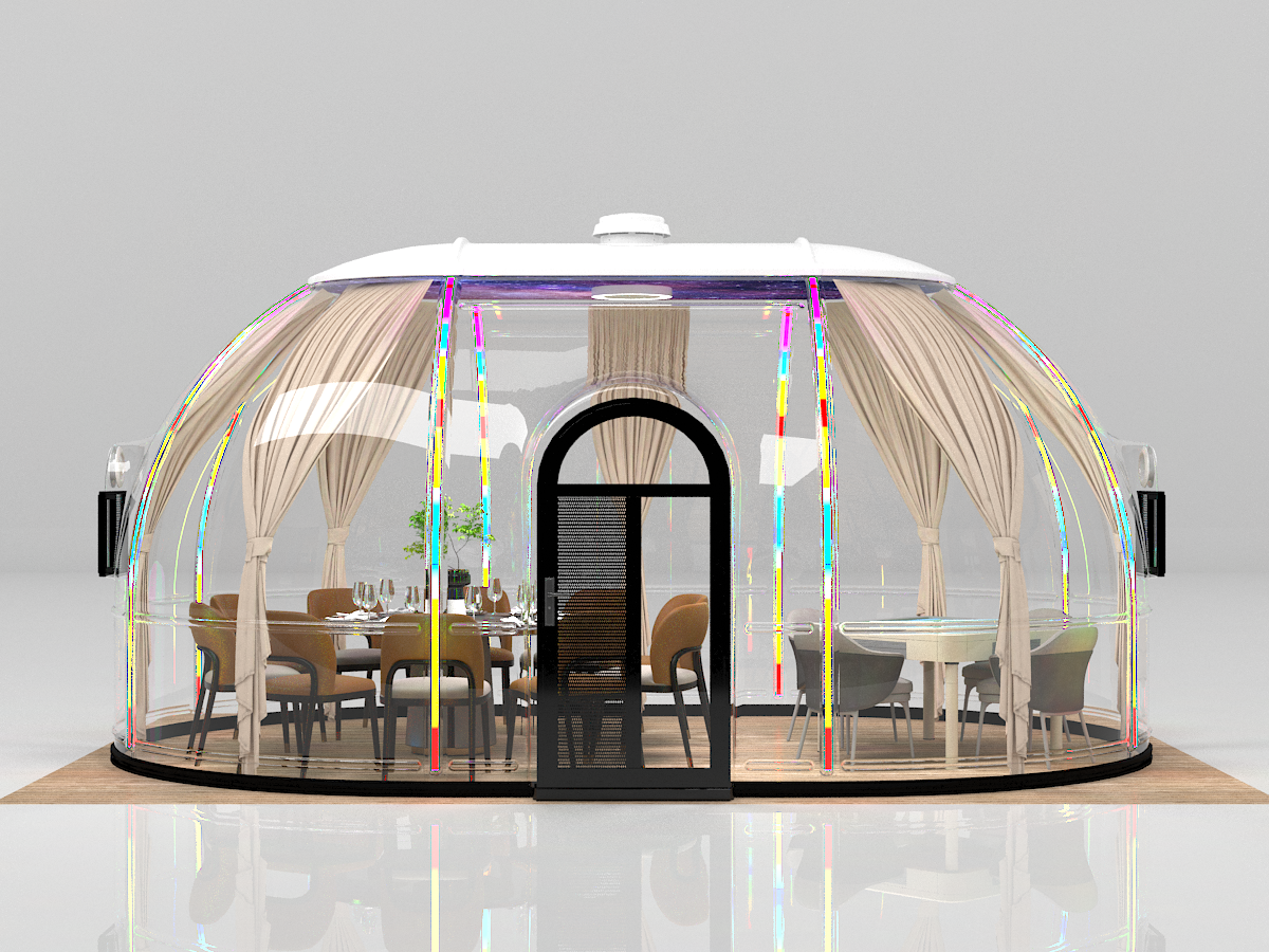 Designed for flexibility and quick installation, this dome capsule is perfect for outdoor dining areas, cafés, resorts, events, lounges, and experiential spaces. Fully enclosed and weather-resistant, it provides comfort, protection, and standout aesthetics in one elegant solution.